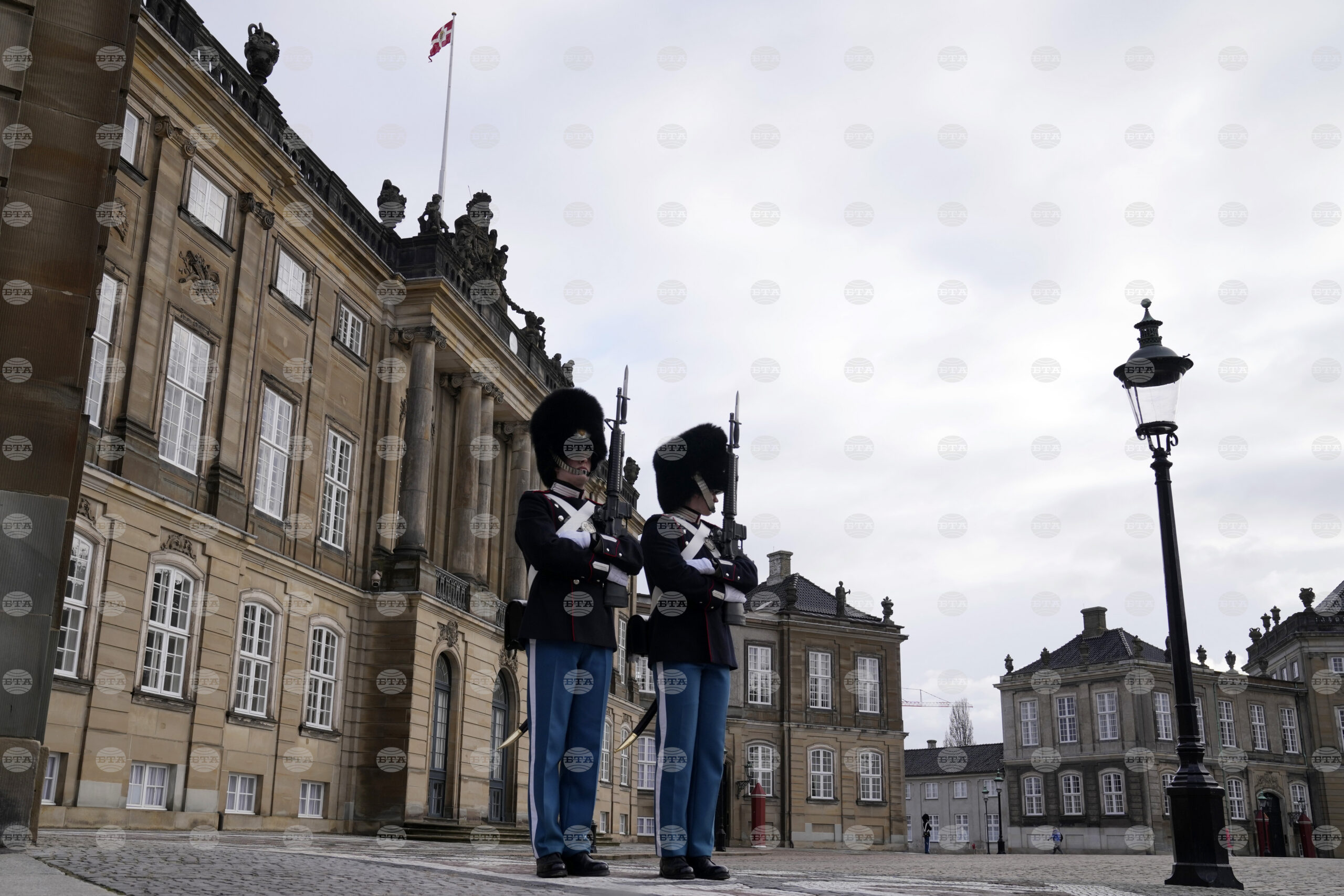 A changing of the guard at The Amalienborg Palace, home of the Danish Royal family in Copenhagen, Denmark Monday, Feb. 21, 2022. (AP Photo/Alastair Grant)