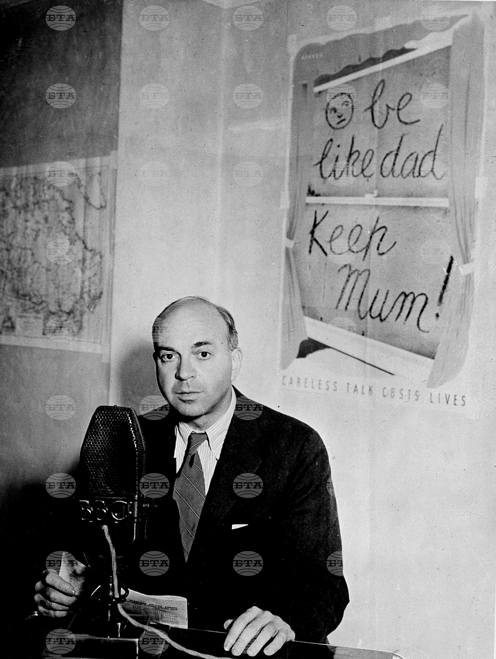 American author and journalist John Dos Passos broadcasts on BBC's shortwave service program "Answering You" in London, England, in Oct. 1941, during World War II. The poster behind him is a message from the Ministry of Information's "Careless Talk" campaign. (AP Photo)