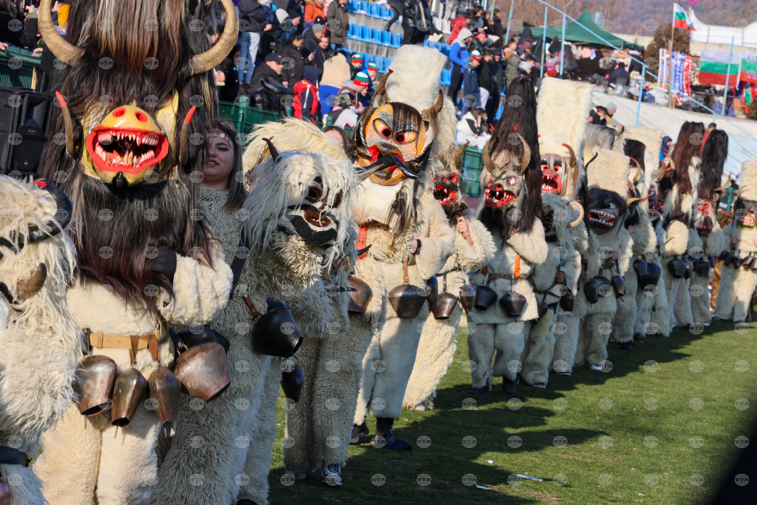 Симитли (13 януари 2024) Хиляди участници дефилират на стадион „Септември“ в град Симитли, където се състои фестивалът „Симитлия - древната земя на кукерите“. Снимка: Красимир Николов/БТА (БТ)