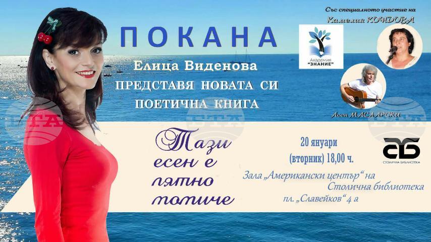 Столицата се готви да посрещне едно значимо литературно събитие – официалната премиера на най-новата поетична книга на Елица Виденова, озаглавена „Тези есен е лятно момиче“. Събитието е насрочено за 20 януари, когато от 18:00 ч. врати ще отвори зала „Американски център“ в Столичната библиотека. Издателство „Академия „Знание“ е организатор на представянето, което обещава да събере любителите на поетичното слово.