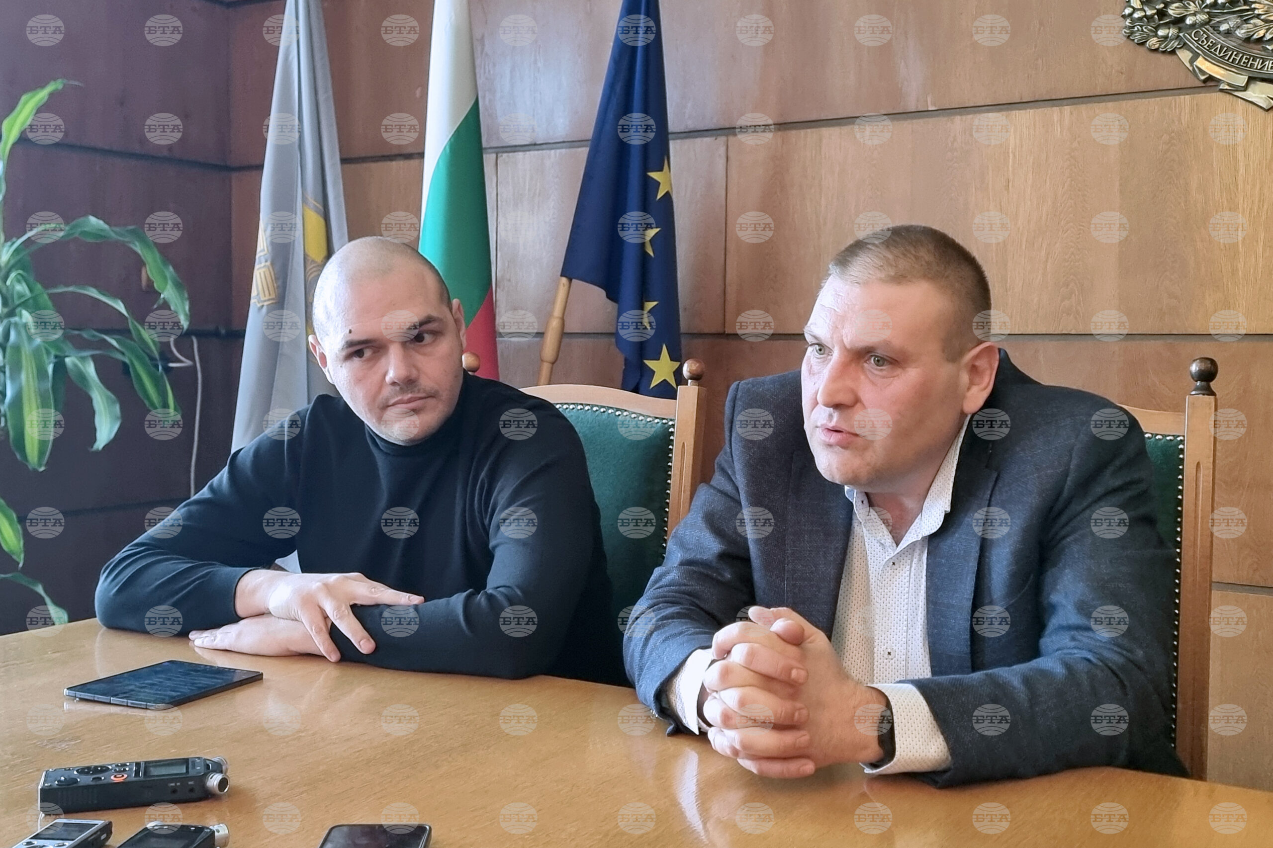 Плевен (12 януари 2026) В Община Плевен се провежда брифинг по повод резултатите от снегопочистването и зимната обстановка в региона след снеговалежа през вчерашния ден. На снимката: заместник-кметът с ресор „Териториално развитие“ Христо Кочев и кметът д-р Валентин Христов (вдясно) коментират работата на снегопочистващите фирми в община Плевен. Снимка: кореспондент на БТА в Плевен Елина Кюркчиева (ЕВ)