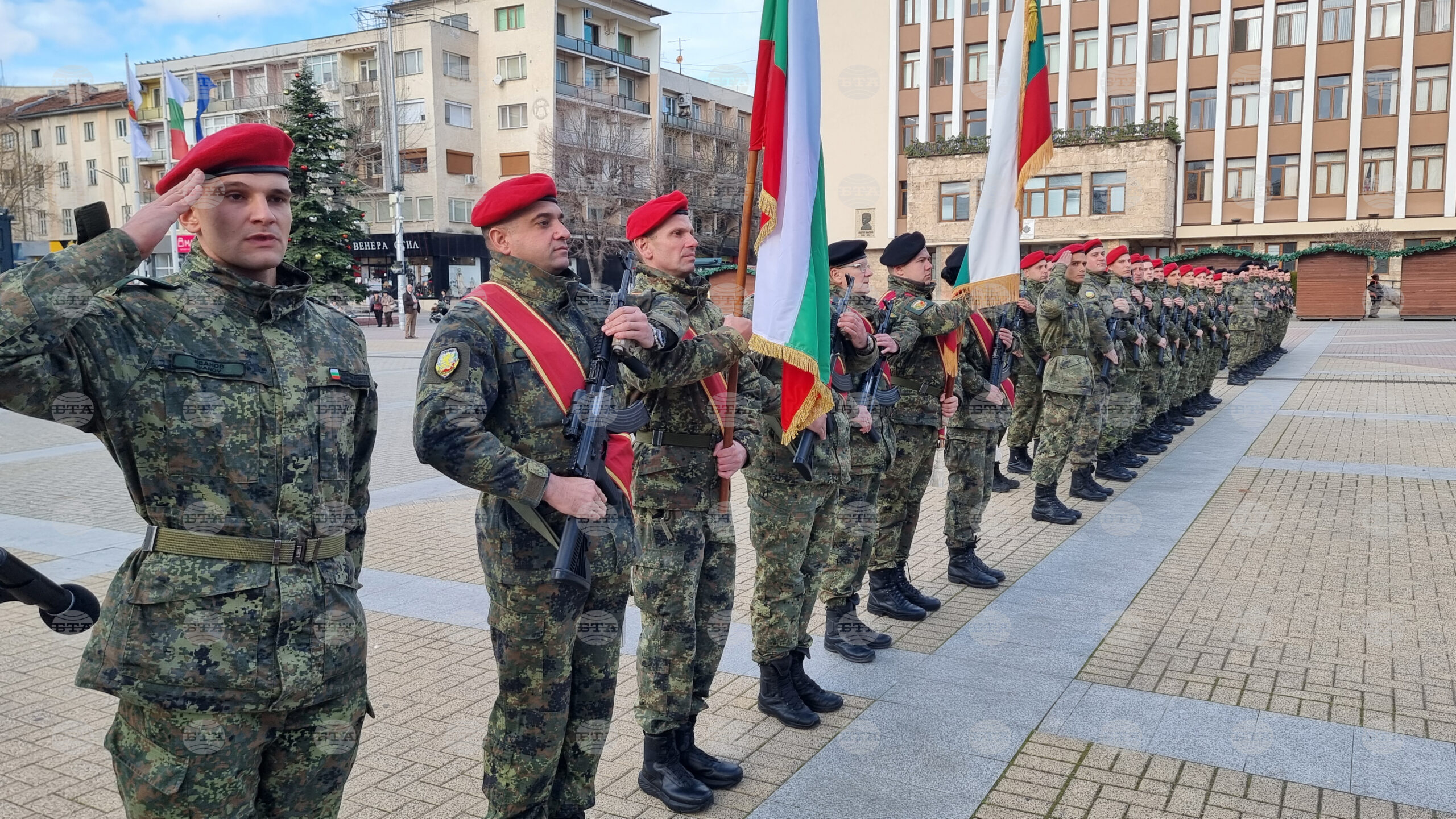 Хасково (6 януари 2026) Церемония по освещаване на бойните знамена на армията се провежда пред паметника на Незнайния войн на централния площад „Свобода“ в Хасково. Водосвет отслужиха отец Никола и отец Константин. Строят бе от две роти от военните формирования 52 740 и 22 280. Снимка: кореспондент на БТА в Хасково Николай Грудев (ЕВ)