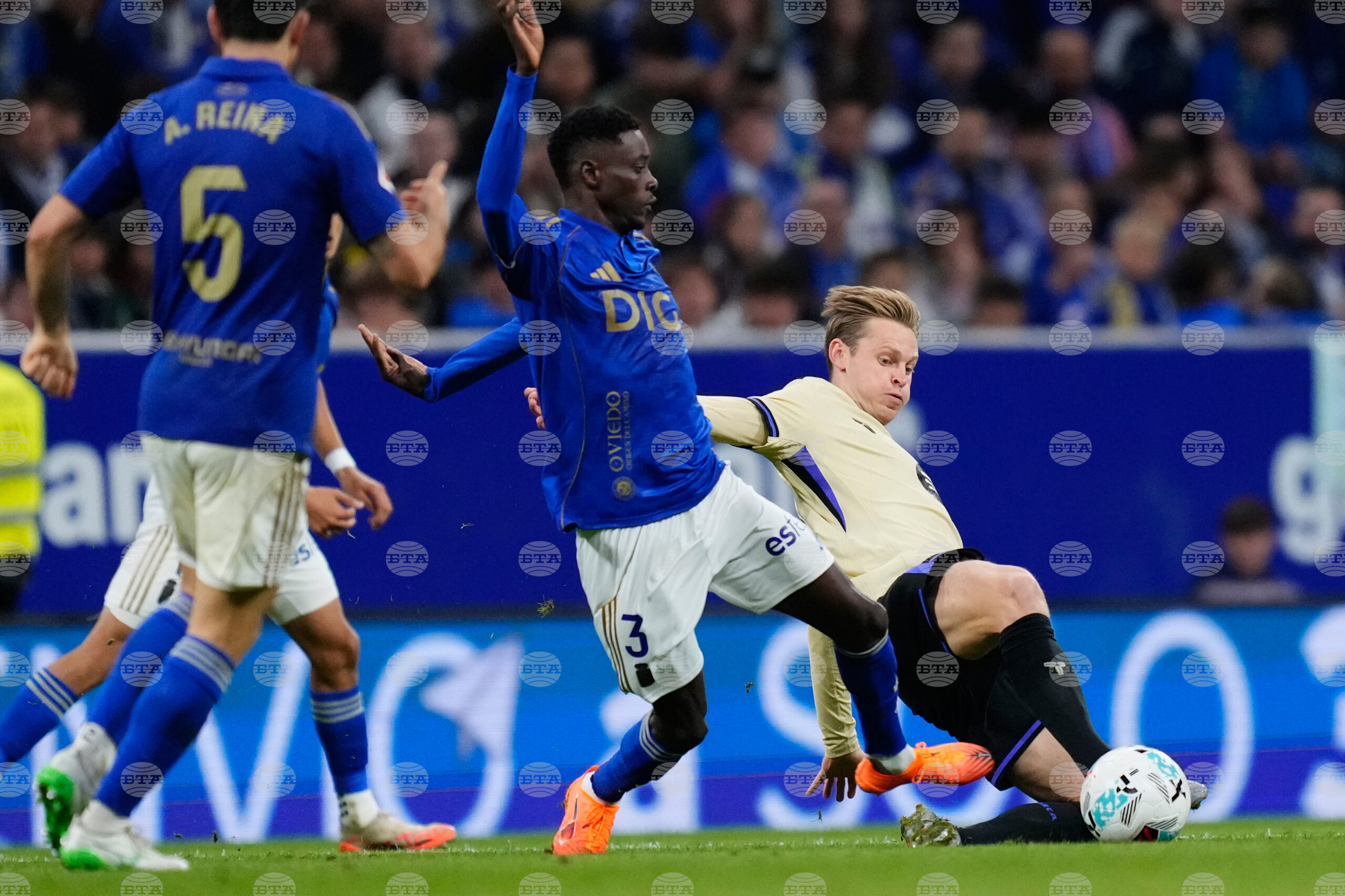Barcelona's Frenkie de Jong fights for the ball against Real Oviedo's Rahim Alhassane during a Spanish La Liga soccer match at the Carlos Tartiere stadium in Oviedo, Spain, Thursday, Sept. 25, 2025. (AP Photo/Jose Breton)