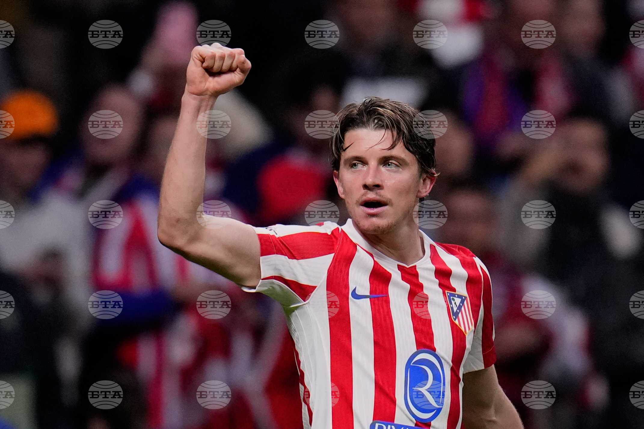Atletico Madrid's Conor Gallagher celebrates his side's second goal during a Champions League opening phase soccer match between Atletico Madrid and Union Saint-Gilloise in Madrid, Spain, Tuesday, Nov. 4, 2025. (AP Photo/Manu Fernandez)